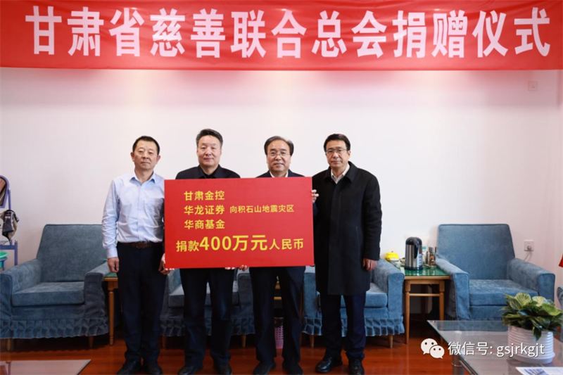 12月21日,甘肃金控集团、华龙证券及华商基金通过甘肃省慈善联合总会,向积石山地震灾区捐款400万元,全力支持抗震救灾工作。