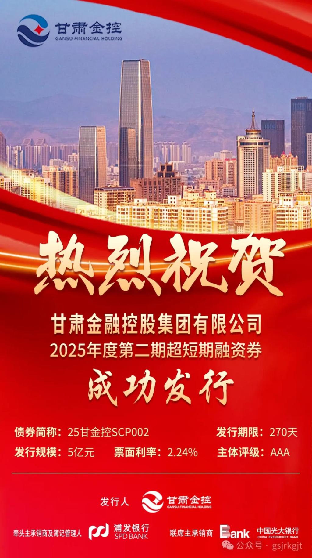 2月24日,甘肃金控集团成功发行2025年度第二期超短期融资券,规模5亿元,期限270天,票面利率2.24%。甘肃金控集团始终秉持稳健经营理念,持续提升核心竞争力,此次债券的成功发行,充分体现了市场对集团信用资质和发展前景的信心。