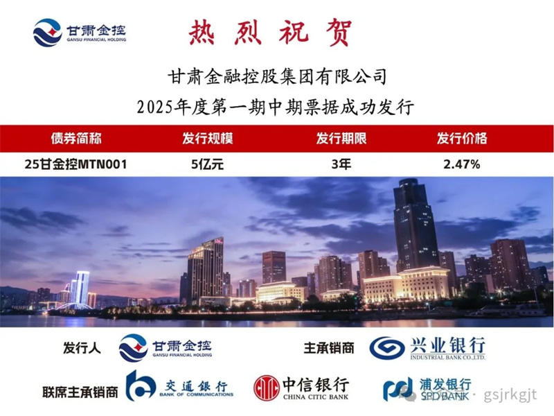 2025年6月10日,甘肃金控集团成功发行2025年度第一期中期票据“25甘金控MTN001”,规模5亿元,期限3年,票面利率2.47%,全场倍数2.72倍,体现出市场对集团稳健经营和良好偿债能力的信心。